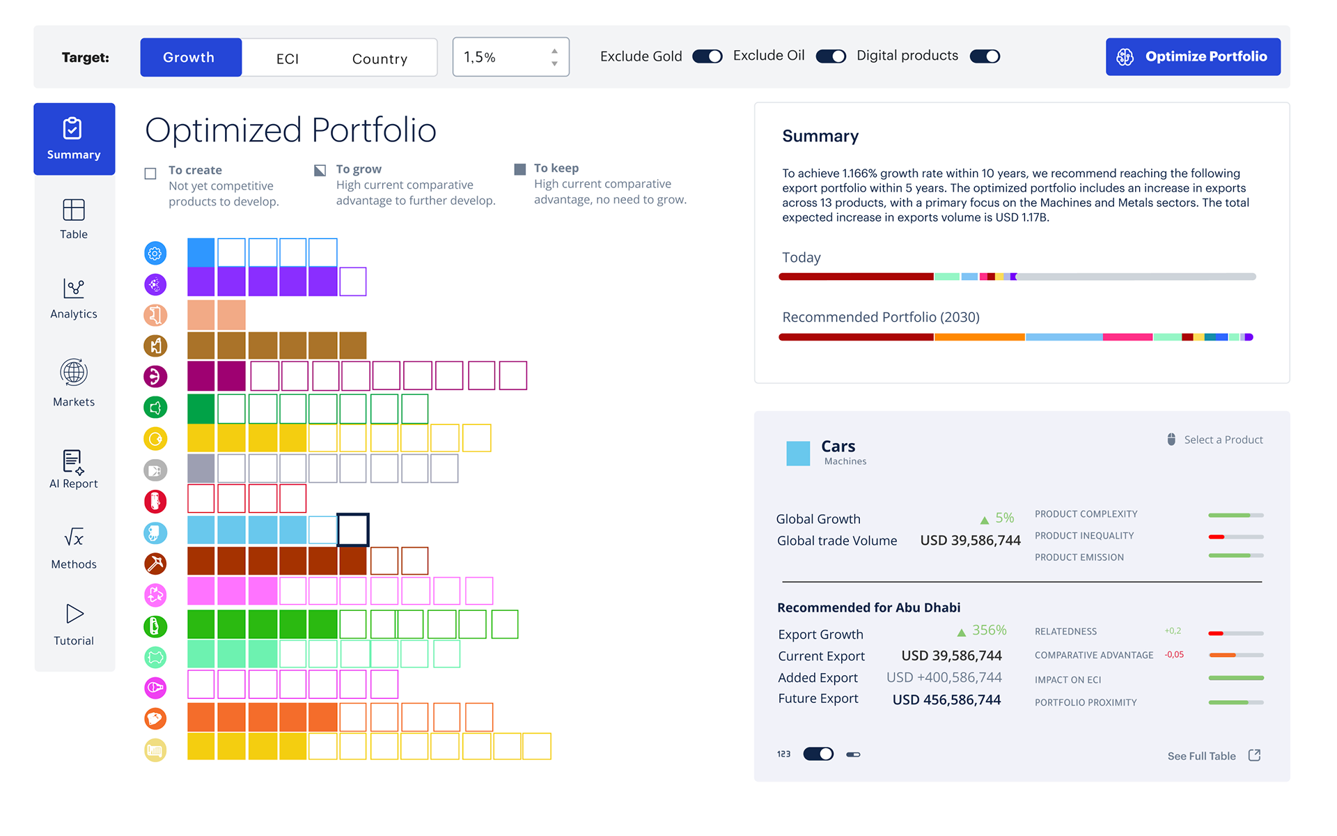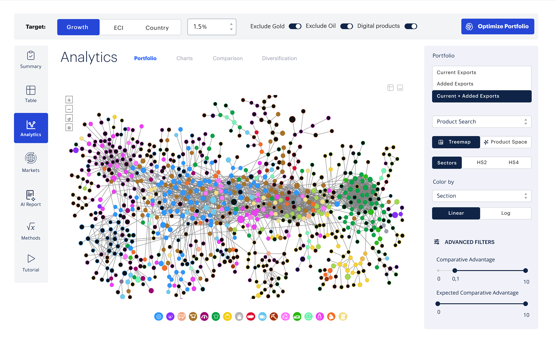 The tool advances the policy toolkit for economic complexity by providing governments with a structured, data-driven framework for strategic diversification — moving beyond visual heuristics to a formally optimised approach. It has been deployed to support national economic strategies across multiple countries, helping ministries of trade and investment identify high-potential sectors, benchmark against peer economies, and build evidence-based industrial policy.
